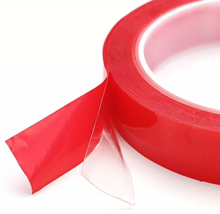 Двусторонняя лента ADHESER представляет собой двустороннюю клейкую ленту на на прозрачной полиэстеровой основе с полимерным лайнером красного цвета.